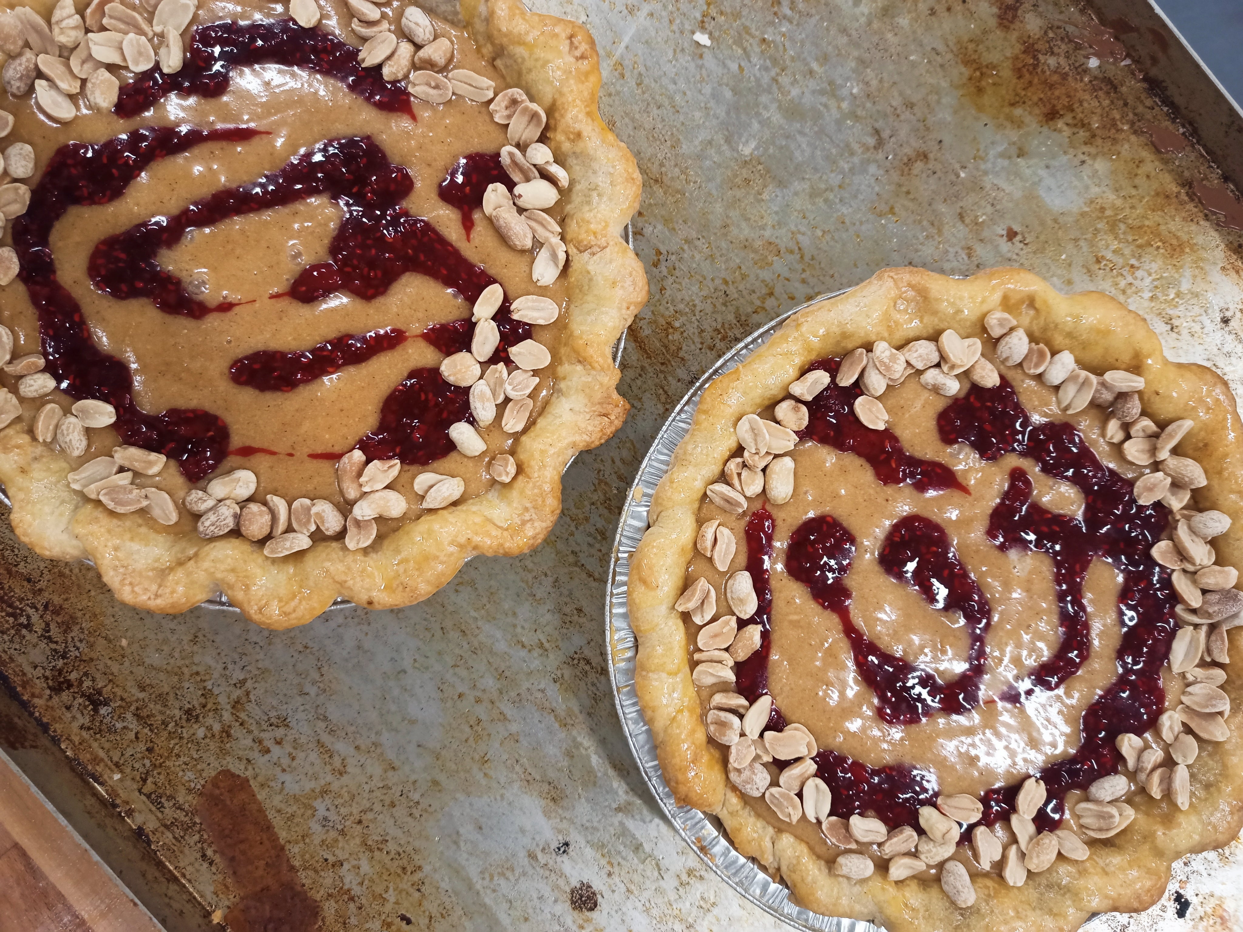 This pie is special. Loads of peanut butter goes into this pie which then topped with whole roasted peanuts and a swirl of seasonal jam.